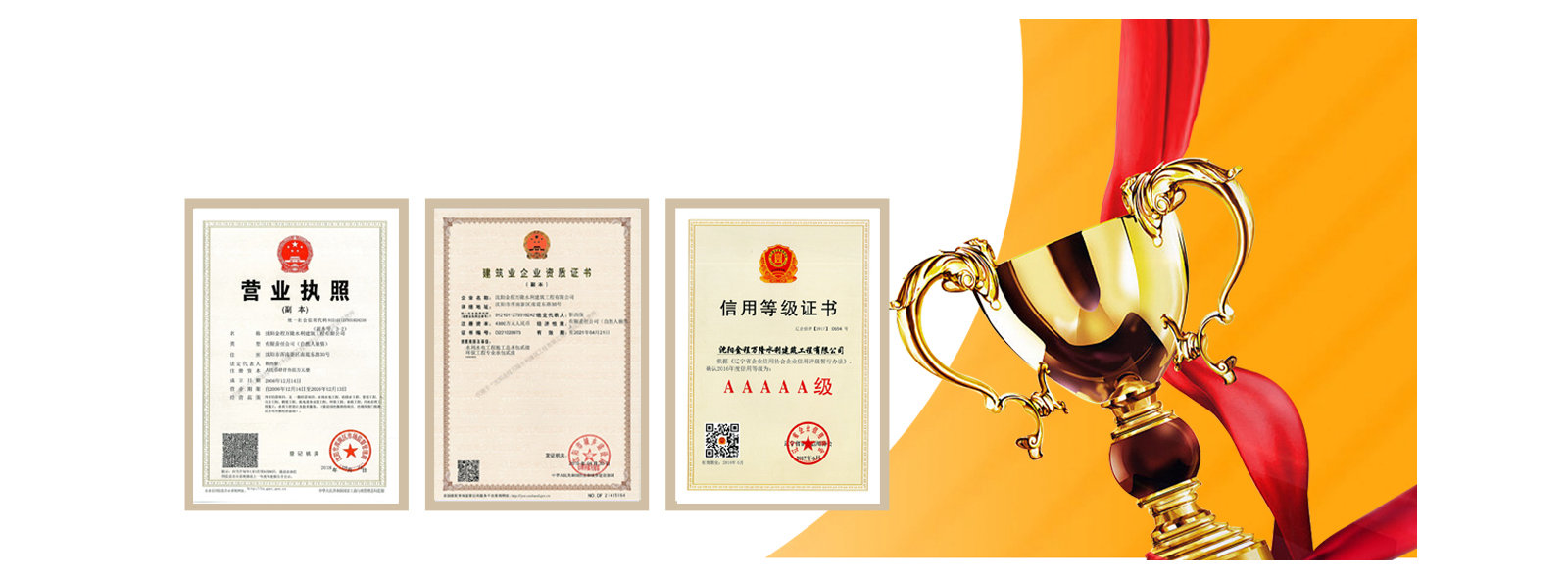 我公司先后受到遼寧省建筑業(yè)協(xié)會(huì)的好評(píng),遼寧省及沈陽(yáng)市工商局頒發(fā)的重合同守信譽(yù)企業(yè)稱號(hào),勞動(dòng)保障監(jiān)察書(shū)面誠(chéng)信等級(jí)A,信用遼寧網(wǎng)站公示AAA等級(jí),信用沈陽(yáng)網(wǎng)站公示AAA等級(jí),水利安全生產(chǎn)標(biāo)準(zhǔn)化二級(jí)單位,中國(guó)水利工程協(xié)會(huì)信用AAA等級(jí),